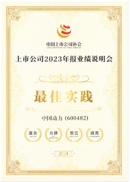 近日,中國上市公司協(xié)會(huì)頒布上市公司 2023 年報(bào)業(yè)績說明會(huì)的獲獎(jiǎng)情況,中國動(dòng)力榮獲最佳實(shí)踐獎(jiǎng)!