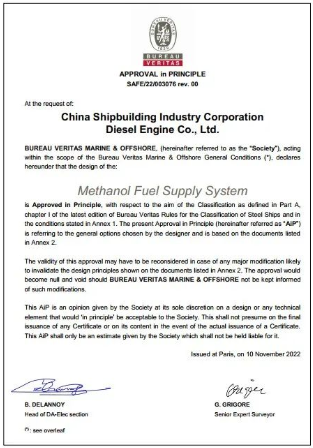 11月11日,中國船舶集團旗下中國動力子公司中國船柴船用甲醇供給系統(tǒng)獲BV船級社原理認可(AIP)證書。作為船舶新型綠色動力,甲醇燃料已經(jīng)成為船舶技術的熱點,中國船柴先后取得了甲醇燃料供給系統(tǒng)發(fā)明專利授權和BV船級社認證,彰顯了公司在甲醇供給應用領域的技術領先性。