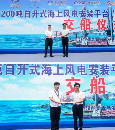 武漢船機黨委書記、董事長馬聚勇,北京神大集團有限公司總經(jīng)理張曉飛,飛勵特船舶管理有限公司副總裁馬利,華夏金融租賃有限公司總裁沈宗慶先后在交船儀式上發(fā)表講話。隨著國家實現(xiàn)“碳達峰、碳中和”目標指引,清潔能源迅速發(fā)展,我國海上風電投入布局和建設加快。為獲取更多的海上風能資源,海上風電正向深遠海風電場拓展,華夏金租神大01號1200噸自升式風電安裝平臺因此而生,是開發(fā)深遠海風電資源的又一利器。該平臺的順利交付,不止是武漢船機依托技術創(chuàng)新、裝備優(yōu)勢、努力拼搏的成就,更是船東、船東代表、監(jiān)理、分包方共同努力耕耘海上風電市場結出的又一碩果。”