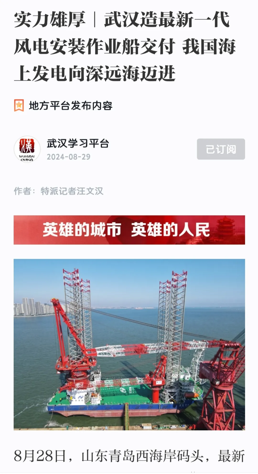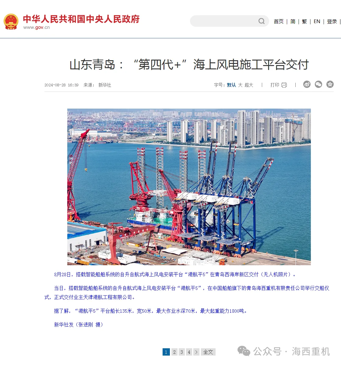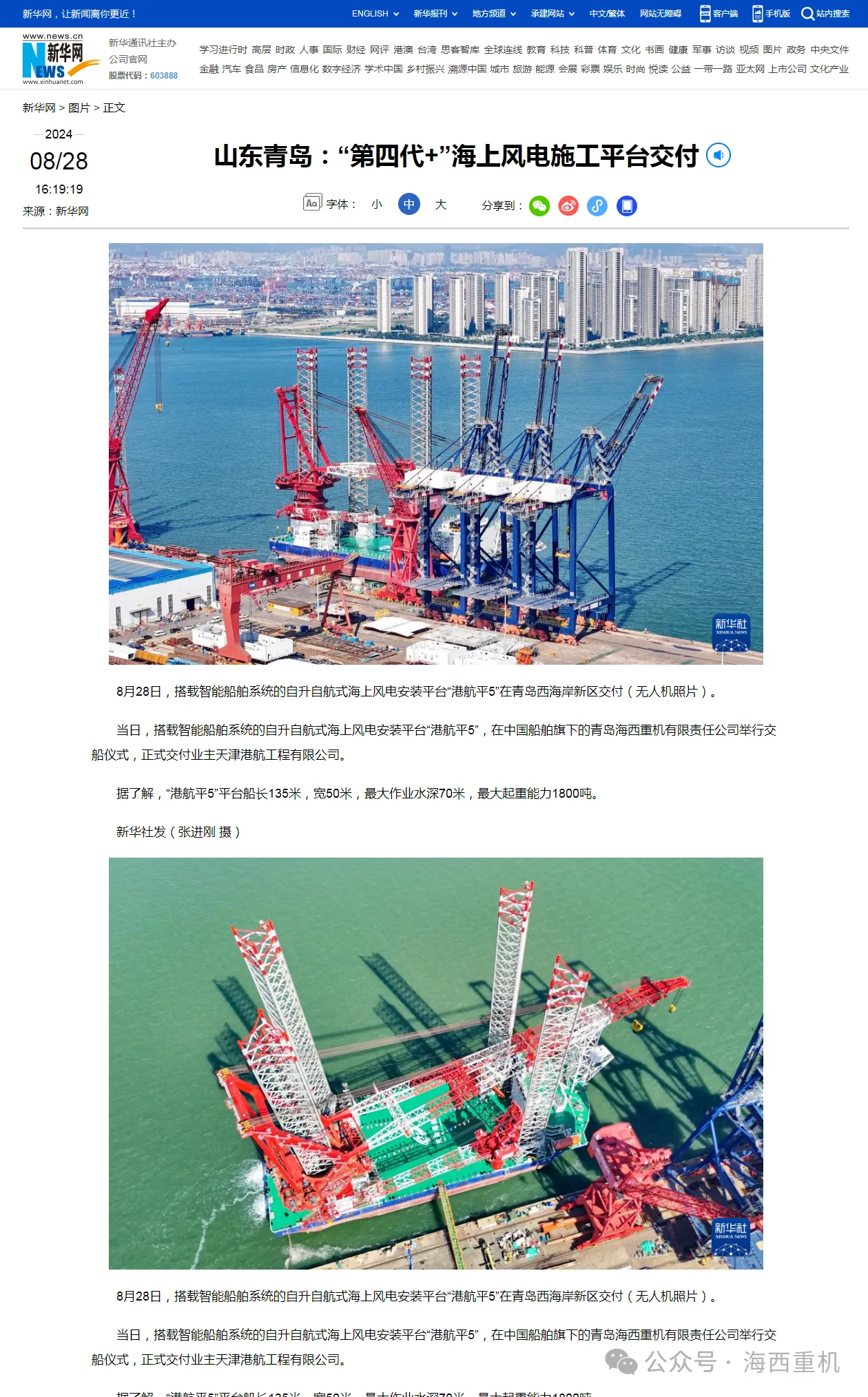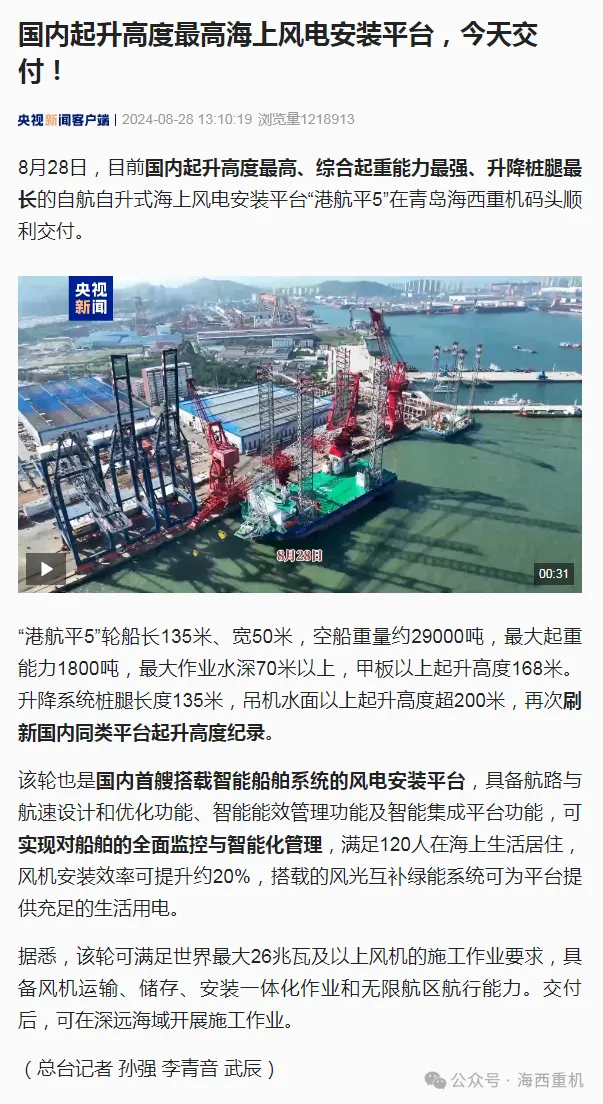 8月28日,中國船舶集團(tuán)旗下中國動力子公司武漢船機(jī)牽頭建造的“第四代+”1800噸海上風(fēng)電安裝平臺“港航平5”在青島海西重機(jī)順利交付! 消息一經(jīng)發(fā)布,就引發(fā)各大媒體關(guān)注報道!