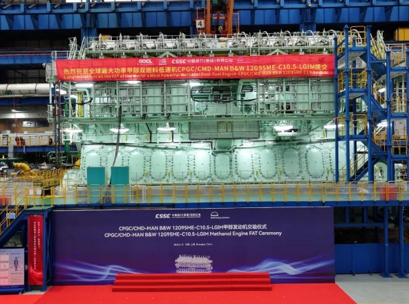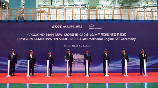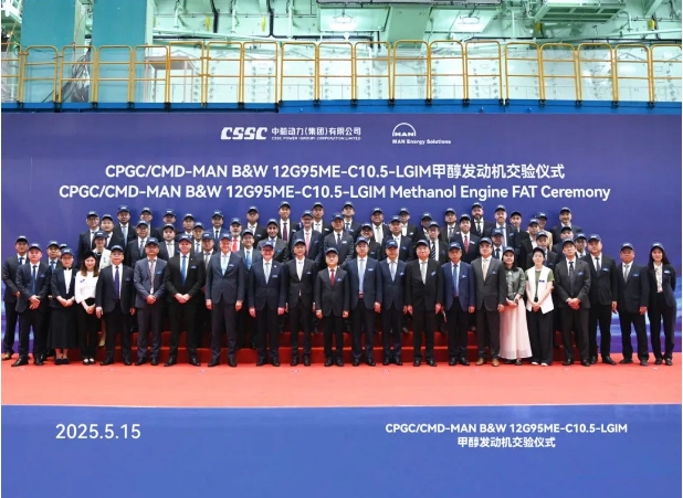 2025年5月15日,中船集團下屬中國動力子公司中船動力(集團)有限公司與MAN Energy Solutions(MAN ES)聯(lián)合舉辦的 CPGC/CMD-MAN B&W 12G95ME-C10.5-LGIM-EGRTC 甲醇發(fā)動機 FAT 交驗儀式在中船動力下屬中船三井成功舉行。來自中國船舶集團有限公司、中遠海運集團有限公司、OOCL、ABS船級社、株式會社三井E&S、大連華銳重工集團股份有限公司等單位的領(lǐng)導(dǎo)、重要客戶與合作伙伴出席儀式。