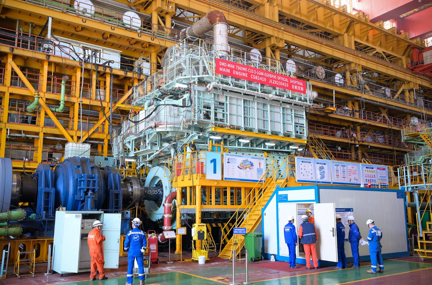 10月26日,隨著船東船檢在《主機(jī)試車(chē)報(bào)告》和《議定書(shū)》上簽字,中船集團(tuán)旗下中國(guó)動(dòng)力子公司中船發(fā)動(dòng)機(jī)首臺(tái)7S60MEC-LGIM-EGRBP左舷甲醇雙燃料主機(jī)順利交驗(yàn)。