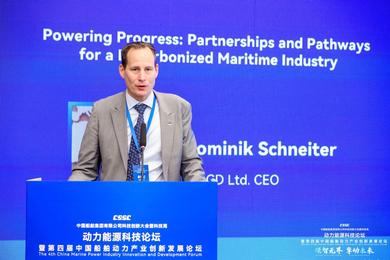 WinGD公司 CEO Dominik Schneiter 分享了國(guó)際海事產(chǎn)業(yè)脫碳合作的實(shí)踐路徑,強(qiáng)調(diào)航運(yùn)業(yè)脫碳需通過(guò)多燃料戰(zhàn)略、全生命周期解決方案與跨界協(xié)作實(shí)現(xiàn),并介紹了 WinGD X-DF 發(fā)動(dòng)機(jī)平臺(tái)在氨、甲醇等替代燃料應(yīng)用中的領(lǐng)先成果,以及與產(chǎn)業(yè)鏈伙伴協(xié)同推動(dòng)技術(shù)落地的經(jīng)驗(yàn)。