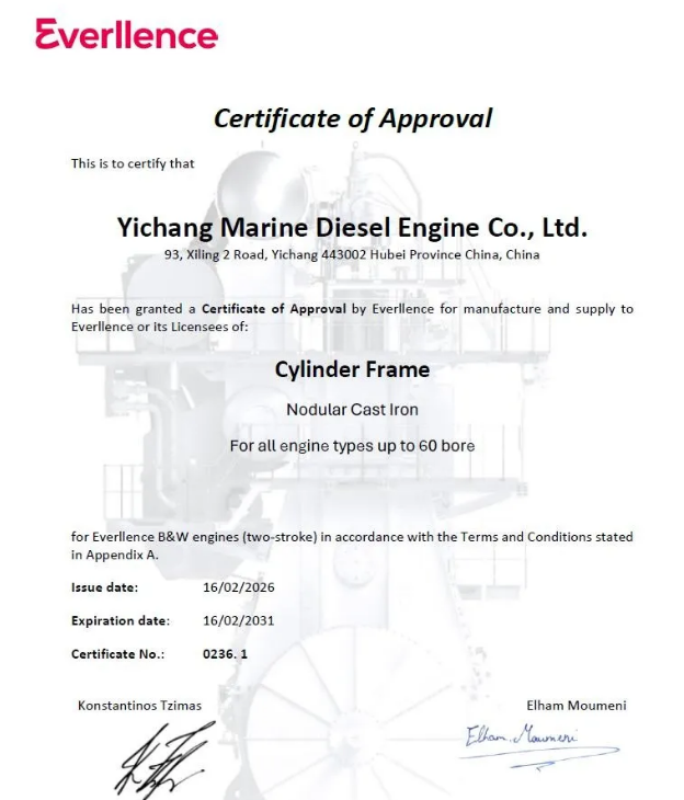 日前,中國動(dòng)力下屬中船宜柴公司收到Everllence專利公司頒發(fā)的600mm以下缸徑球墨鑄鐵氣缸體生產(chǎn)認(rèn)可證書。至此,宜柴公司已取得船用低速機(jī)三大關(guān)重件——缸體、缸套、中間體的全部生產(chǎn)認(rèn)可證書。