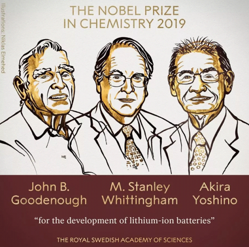 2019年諾貝爾化學獎授予John B. Goodenough, M. Stanley Whittingham, Akira Yoshino,以表彰他們在鋰電池領(lǐng)域的貢獻。