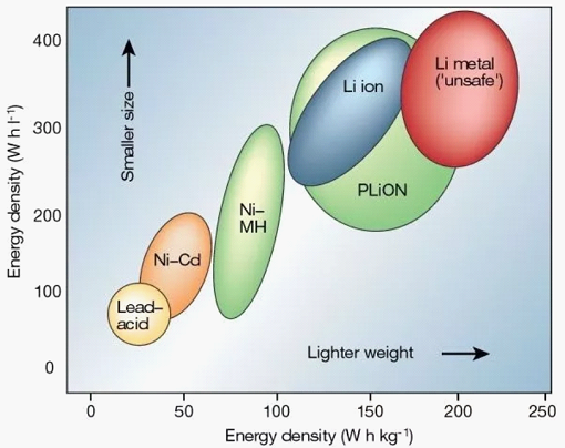 不同的電池技術(shù)在體積和重量能量密度方面的對比