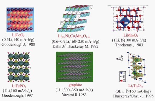 商業(yè)鋰離子電池正負極材料的示意圖、主要發(fā)明人、發(fā)明時間