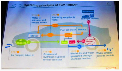 644km,聽到這個(gè)數(shù)字相信很多朋友估計(jì)都會(huì)有一些小小的激動(dòng),畢竟咱們國(guó)內(nèi)續(xù)航里程最高的電動(dòng)車差不多也就四五百公里了,而這臺(tái)車一來就是600多公里,這著實(shí)調(diào)動(dòng)了人們的興趣。而說到這臺(tái)豐田Mirai的原理其實(shí)也很簡(jiǎn)單,它利用空氣中的氧氣(綠色)以及氣罐內(nèi)的氫氣(紅線)在發(fā)電裝置內(nèi)發(fā)生反應(yīng),產(chǎn)生的電能(橙線)輸送給電動(dòng)機(jī)用于驅(qū)動(dòng)車輛,剩余的電能則儲(chǔ)存在電池中,用于車輛急加速或?yàn)檐嚿系挠秒娫O(shè)備供電。化學(xué)反應(yīng)之后產(chǎn)生的水(藍(lán)線)直接排除車外即可。
