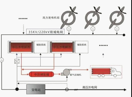 風(fēng)電制氫技術(shù)是將風(fēng)能通過(guò)風(fēng)力發(fā)電機(jī)轉(zhuǎn)化成電能,電能通過(guò)電解水制氫設(shè)備轉(zhuǎn)化成氫氣,通過(guò)將氫氣輸送至氫氣應(yīng)用終端,完成從風(fēng)能到氫能的轉(zhuǎn)化。根據(jù)風(fēng)電來(lái)源的不同,可以將風(fēng)電制氫技術(shù)分為并網(wǎng)型風(fēng)電制氫和離網(wǎng)型風(fēng)電制氫兩種。并網(wǎng)型風(fēng)電制氫是將風(fēng)電機(jī)組接入電網(wǎng),從電網(wǎng)取電的制氫方式,比如從風(fēng)場(chǎng)的35kV或220kV電網(wǎng)側(cè)取電,進(jìn)行電解水制氫,主要應(yīng)用于大規(guī)模風(fēng)電場(chǎng)的棄風(fēng)消納和儲(chǔ)能。離網(wǎng)型風(fēng)電制氫是將單臺(tái)風(fēng)機(jī)或多臺(tái)風(fēng)機(jī)所發(fā)的電能,不經(jīng)過(guò)電網(wǎng)直接提供給電解水制氫設(shè)備進(jìn)行制氫,主要應(yīng)用于分布式制氫或局部應(yīng)用于燃料電池發(fā)電供能。