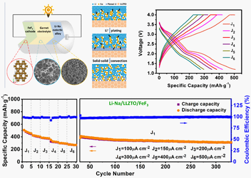 Li-Na/LLZO/FeF3固態(tài)電池構(gòu)架,共晶合金固-固對(duì)流示意圖,Li-Na/LLZO/FeF3電池的倍率和循環(huán)性能