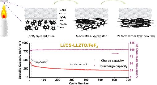 該團(tuán)隊(duì)提出“燭焰(candle soot)燒烤陶瓷”模式改性LLZO/Li界面的策略,顯著剪薄了陶瓷表面的鈍化層,實(shí)現(xiàn)了“轉(zhuǎn)換型”鋰氟化物固態(tài)電池的超長(zhǎng)可逆循環(huán)。LLZO在與空氣接觸后,易與空氣中的水和二氧化碳反應(yīng),在表面形成包含LiOH和Li2CO3的鈍化層,這一鈍化層嚴(yán)重影響了Li與LLZO的接觸,阻斷了界面處的鋰離子傳輸通道,導(dǎo)致電池的界面阻抗過(guò)大,電池性能?chē)?yán)重受限。因此,鈍化層的去除是目前LLZO/Li界面改性研究的重要方向之一。在此背景下,該團(tuán)隊(duì)提出一種簡(jiǎn)易的蠟燭火焰氣相沉積手段,在蠟燭燃燒產(chǎn)生的高溫環(huán)境下,LLZO表面的Li2CO3鈍化層可以被表面沉積的蠟燭煤煙還原,具有多晶石墨化結(jié)構(gòu)的煤煙炭黑層在鋰化后可生成LiC6晶域,具有離子/電子混合導(dǎo)電性,有利于鋰離子流在界面中間層的高通量傳輸。這種界面改性后的Li/CS-LLZO/FeF3固態(tài)電池表現(xiàn)出優(yōu)異的長(zhǎng)循環(huán)和倍率性能,其初始可逆容量可達(dá)500 mAh·g-1,循環(huán)壽命長(zhǎng)達(dá)至少1500圈,在200 μA·cm-2電流密度下循環(huán)700圈后的可逆容量依然維持在201.0 mAh·g-1。陶瓷基固態(tài)Li-FeF3電池的循環(huán)性能甚至可超過(guò)文獻(xiàn)報(bào)道的液態(tài)Li-FeF3體系。相關(guān)成果發(fā)表于ACS Applied Materials & Interfaces。
