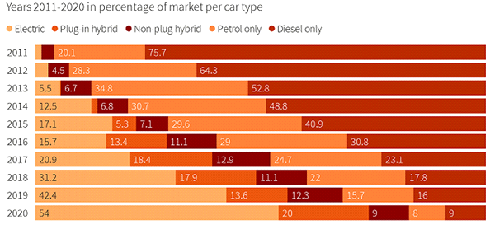 如果一個(gè)國家真的想推廣電動(dòng)車,其實(shí)也很容易,把乘用車的油價(jià)提高一點(diǎn)就可以了。事實(shí)上,還真有國家這么做了,就是挪威。作為歐洲最注重環(huán)保理念的國家之一,挪威雖然是個(gè)產(chǎn)油大國,是世界第七大和西歐最大的石油生產(chǎn)國,但是,挪威卻擁有著全球最高的油價(jià)。當(dāng)前,挪威汽油價(jià)格在16元/升左右,為全球之最。正是在高額的油價(jià)倒逼下,即使位于高緯寒冷地帶,挪威人普遍選擇購買純電動(dòng)車型。近日,據(jù)挪威公路聯(lián)合會(huì)(OFV)周二發(fā)布的數(shù)據(jù),2020年該國電動(dòng)車銷量占全市場比例達(dá)到54.3%,成為全世界首個(gè)全年電動(dòng)車銷量占比過半的國家。短短十年間,電動(dòng)車在挪威的市占率從區(qū)區(qū)1%上升至超越半數(shù),高油價(jià)和高純電動(dòng)車補(bǔ)貼功不可沒。從具體數(shù)據(jù)來看,挪威2020年總共銷售了141,412輛新車,其中76,789輛為純電動(dòng)車。