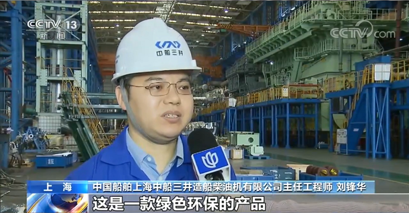 ????中國船舶上海中船三井造船柴油機有限公司主任工程師 劉鋒華:尺寸最大,達到了5層樓那么高,功率達到了63800多千瓦,功率也是最大的。這是一款綠色環(huán)保的產(chǎn)品,使用燃氣運行時氮氧化物的排放不到常規(guī)發(fā)動機的十分之一,硫氧化物和顆粒物的排放也是非常好的,不用裝任何后處理設(shè)備,都可以滿足IMO(國際海事組織)最新的排放法規(guī)要求。