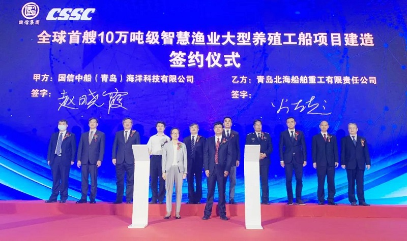 ????6月3日,中國船舶集團有限公司旗下武船集團青島北海船舶重工有限責任公司與國信中船(青島)海洋科技有限公司在青島西海新區(qū)正式簽署全球首艘10萬噸級智慧漁業(yè)大型養(yǎng)殖工船的建造合同。本次簽約標志著養(yǎng)殖工船項目正式進入實質性建造階段,該船將于2022年3月交付。中國船舶集團黨組成員、副總經理孫偉,青島市副市長耿濤等領導和嘉賓出席簽約儀式。