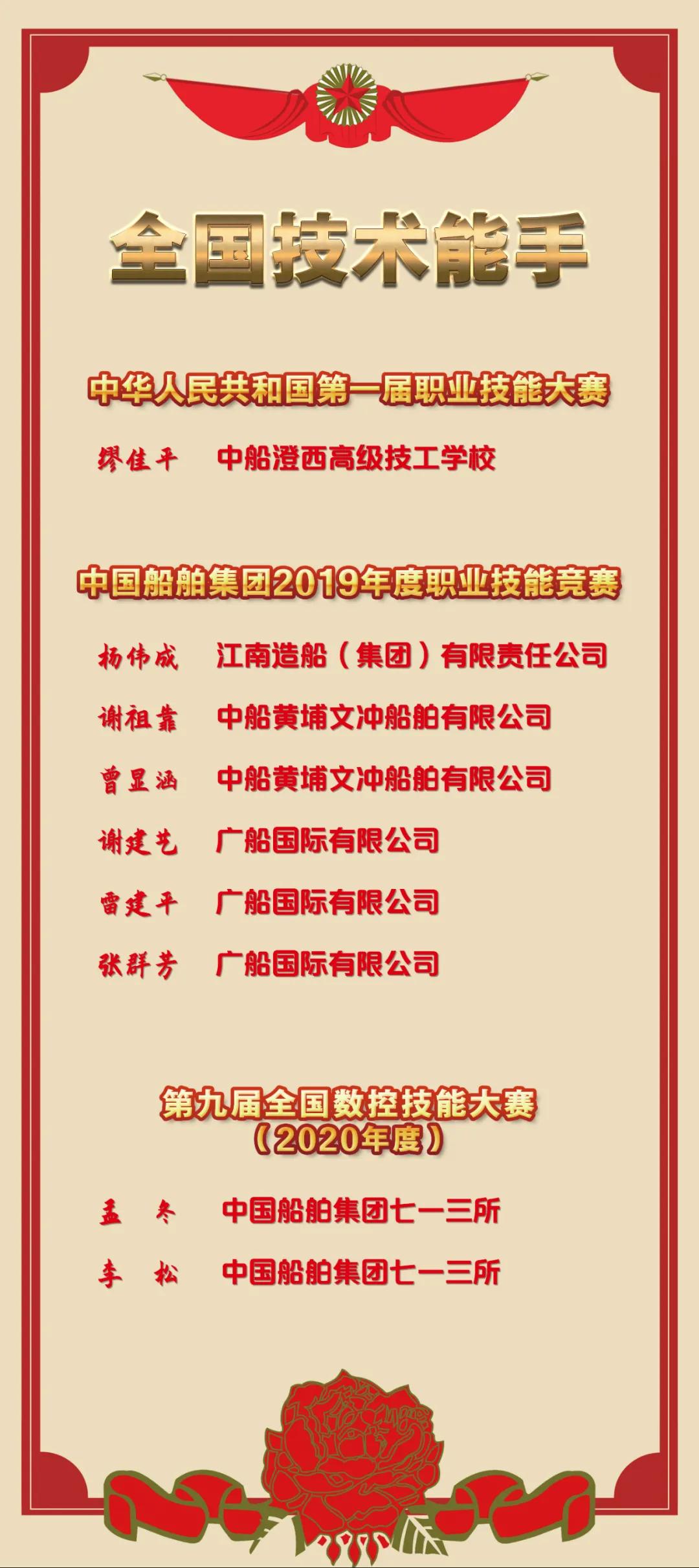 近日,人力資源社會保障部發(fā)布《關于授予2019—2020年度職業(yè)技能競賽優(yōu)秀選手全國技術能手稱號的決定》,中國船舶集團共9名高技能人才,分別在中華人民共和國第一屆職業(yè)技能大賽及2019~2020年度國家級一類、二類職業(yè)技能競賽中取得優(yōu)異成績,被授予“全國技術能手”稱號。