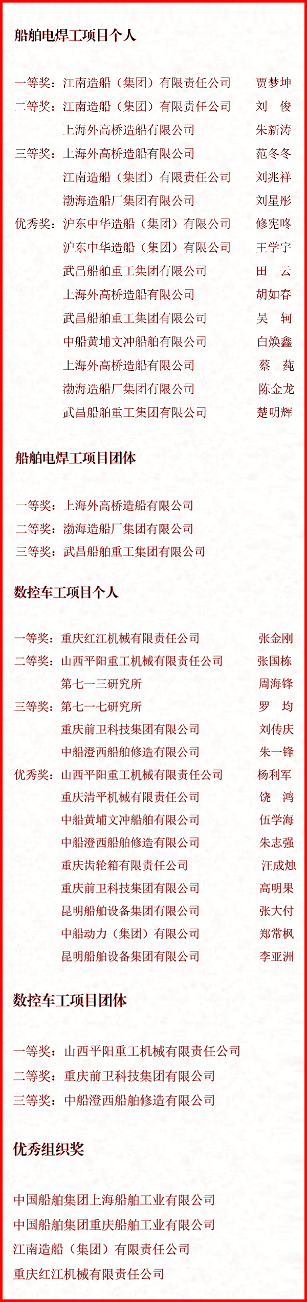 9月27日至9月30日,中國船舶集團(tuán)有限公司聯(lián)合中國就業(yè)培訓(xùn)技術(shù)指導(dǎo)中心,在上海、重慶兩地成功舉辦了國家二類競賽——“2021年全國行業(yè)職業(yè)技能競賽—中國船舶集團(tuán)有限公司職業(yè)技能競賽”。來自49家成員單位共計128名選手同臺角逐,最終評選出個人及團(tuán)體一、二、三等獎和個人優(yōu)秀獎,優(yōu)秀組織獎等獎項(xiàng)。