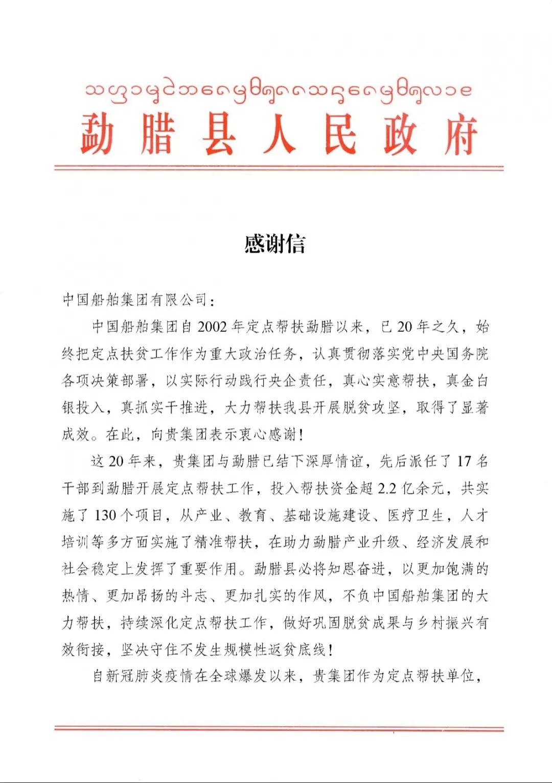春節(jié)前夕,中國船舶集團(tuán)陸續(xù)收到云南省委省政府、文山州委州政府、鶴慶縣委縣政府、勐臘縣政府發(fā)來的感謝信,對集團(tuán)公司長期以來給予鶴慶縣、勐臘縣、丘北縣的傾力幫扶表示衷心感謝和崇高敬意。