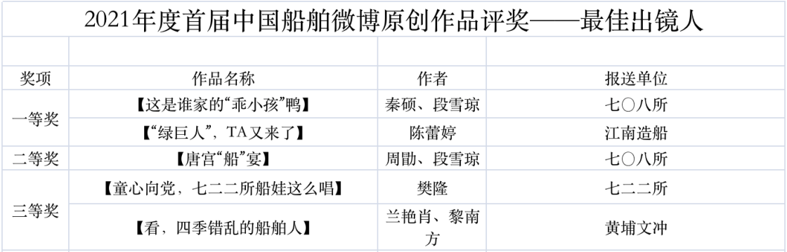 為鼓勵(lì)更多成員單位積極加入到中國船舶集團(tuán)新媒體平臺的宣傳中來,在集團(tuán)公司黨群工作部的指導(dǎo)下,中國船舶報(bào)社從不同維度,對2021年度各單位支持“中國船舶”微信的力度進(jìn)行了梳理統(tǒng)計(jì),并利用微博政務(wù)的全國專家?guī)煸u審資源,對2021年度“中國船舶”微博原創(chuàng)作品進(jìn)行了專業(yè)評審,評選結(jié)果公布如下: