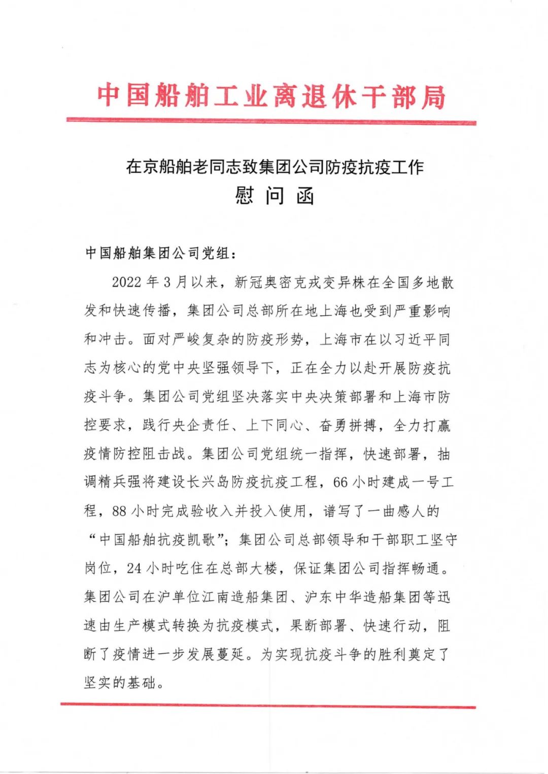 抗疫形勢(shì)嚴(yán)峻復(fù)雜,中國(guó)船舶集團(tuán)離退休老領(lǐng)導(dǎo)老同志關(guān)注抗疫、心系集團(tuán),為干部職工加油鼓勁。
