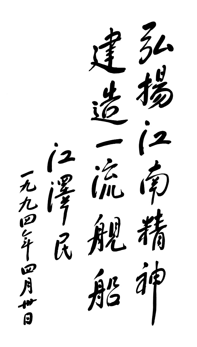 1994年4月30日,江澤民同志為江南造船題詞“弘揚(yáng)江南精神,建造一流艦船”。