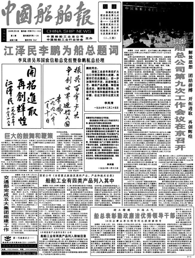 1998年1月16日,《中國(guó)船舶報(bào)》報(bào)道江澤民、李鵬為中國(guó)船舶工業(yè)總公司題詞。