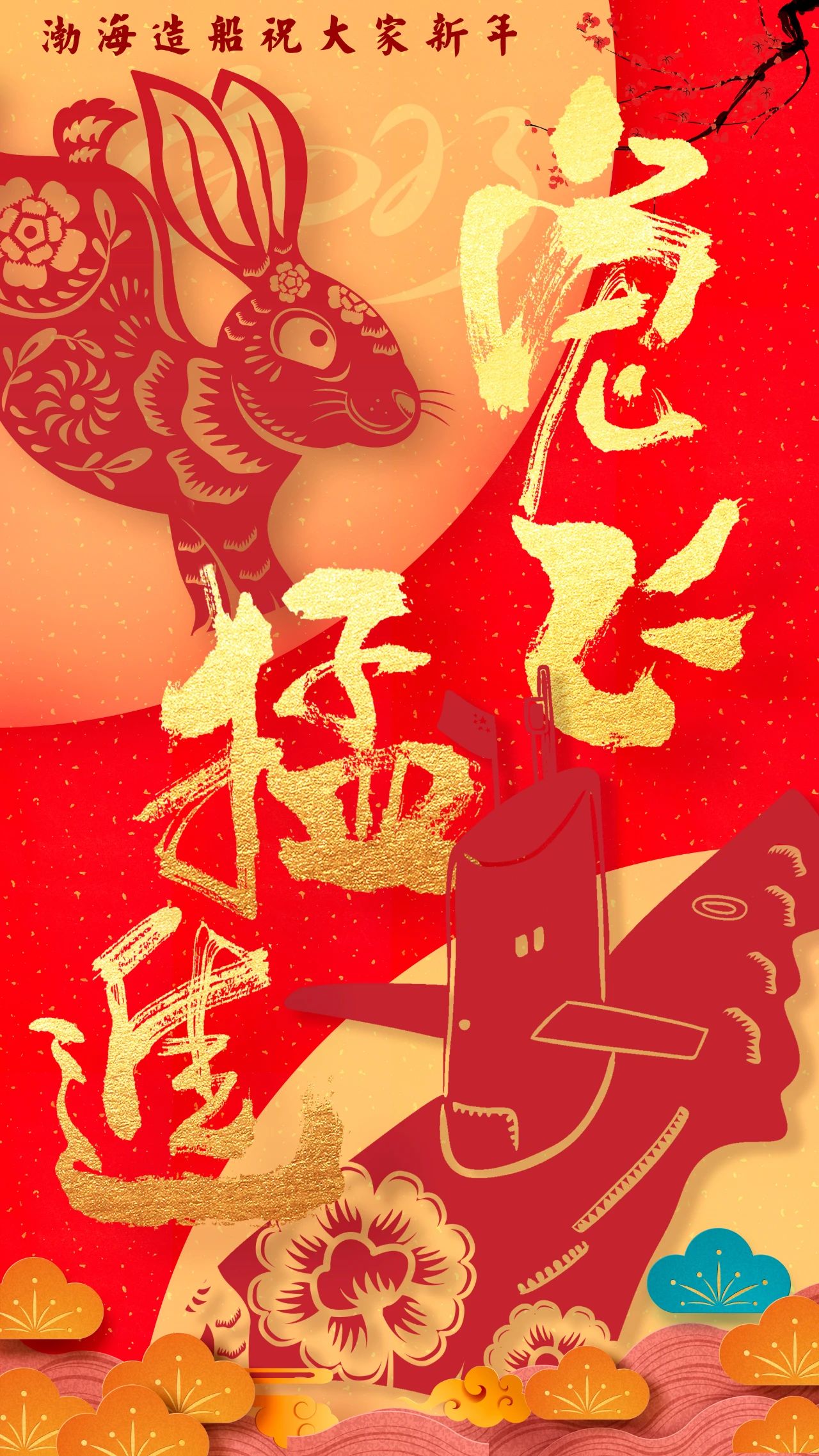 渤海造船的拜年海報(bào)以紅色背景為基礎(chǔ),奠定喜慶祥和的節(jié)日氛圍,畫面主體采用中國(guó)傳統(tǒng)民間剪紙藝術(shù),將飛騰的瑞兔與破浪的國(guó)之重器有機(jī)結(jié)合,讓我們2023年突飛猛進(jìn),大展宏圖!