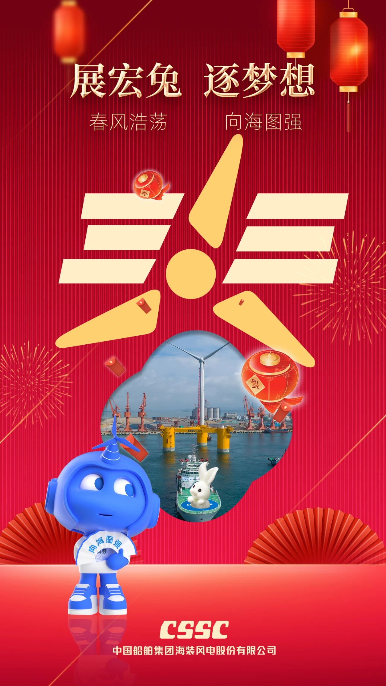 海報(bào)主體部分以國(guó)內(nèi)首臺(tái)深遠(yuǎn)海浮式風(fēng)電裝備“扶搖號(hào)”為創(chuàng)意點(diǎn),通過含有“大風(fēng)車”形象的寫意“春”字,表達(dá)中船海裝將在春風(fēng)浩蕩中大展宏“兔”,在向海圖強(qiáng)征程中矢志奮斗!