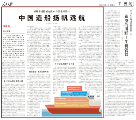 3月1日,《人民日報》報道,中國造船業(yè)國際市場份額已連續(xù)13年位居全球第一,中國船舶集團堅持創(chuàng)新驅(qū)動,液化天然氣運輸船訂單取得新突破,首制國產(chǎn)大型郵輪緊鑼密鼓施工中,旗下企業(yè)深入推進數(shù)字化轉(zhuǎn)型。一起來看詳細報道。