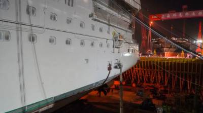 △ 廣船國際的船塢里,兩船出塢在做最后的準(zhǔn)備。