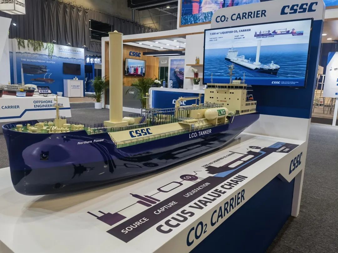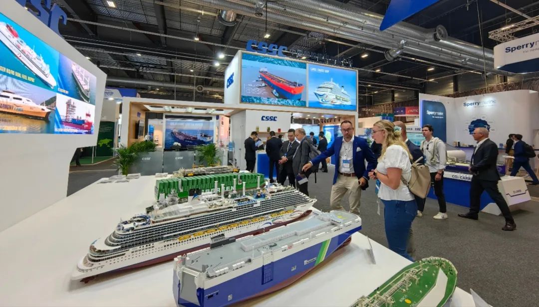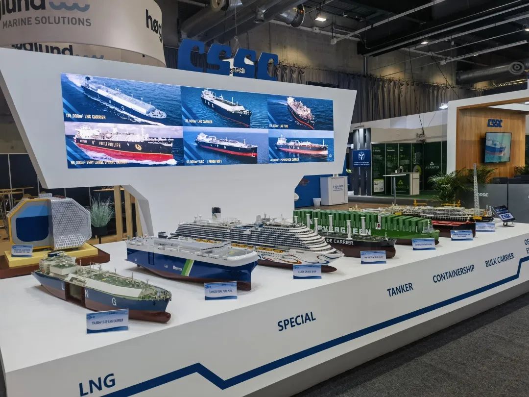 本次展會,中國船舶集團(tuán)積極踐行“走出去”發(fā)展戰(zhàn)略,緊盯目標(biāo)市場特點(diǎn)和需求,重點(diǎn)展示了近年來船舶海工及動力機(jī)電產(chǎn)品在綠色、低碳、環(huán)保方面取得的最新進(jìn)展和相關(guān)成果,包括全球首制7500立方米液態(tài)二氧化碳運(yùn)輸船、17.4萬立方米大型LNG運(yùn)輸船、7000CEU雙燃料汽車滾裝船、23000TEU超大型雙燃料集裝箱船、21萬噸氨燃料散貨船、30萬噸級FPSO、全球首艘10萬噸級智慧養(yǎng)殖工船,以及 12X92DF雙燃料低速機(jī)、LNG供氣系統(tǒng)、船用碳捕捉系統(tǒng)等。集團(tuán)公司展臺吸引了眾多國內(nèi)外知名船東、船級社、設(shè)備廠商等到訪觀摩,交流了當(dāng)前市場熱點(diǎn)并探討了未來合作機(jī)遇。