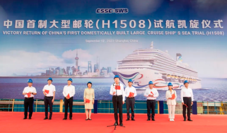 現(xiàn)場(chǎng)舉行了簡(jiǎn)短的歡迎儀式。溫剛宣布中國首制大型郵輪完工試航所有驗(yàn)證項(xiàng)目全部達(dá)標(biāo),試航任務(wù)圓滿完成。