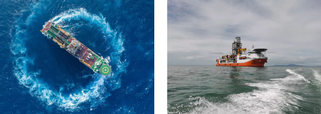 # 通過配置最先進的DP-3級動力定位系統(tǒng),自動調(diào)整船舶底部7臺推進器的轉(zhuǎn)向和推力大小,來抵抗海上風、浪、流作用在船上的載荷,使船舶在海上保持一定的水平位置;