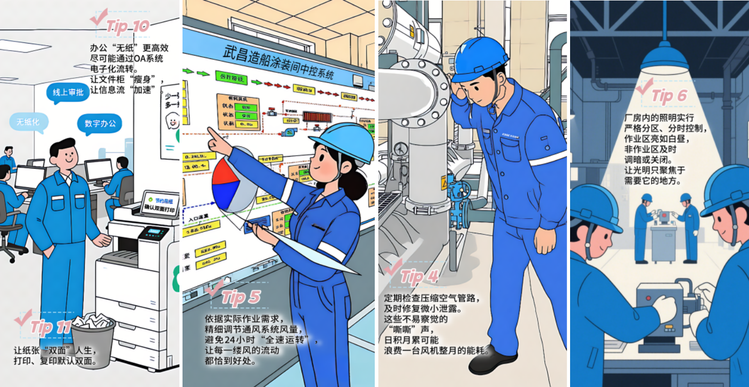 武昌造船在節(jié)能宣傳周期間組織開展了“船廠節(jié)能秘籍”征集活動,以船廠員工的一天為軸線,收集到各類節(jié)能基本操作,形成了《這些基本操作,我知道你一定能做到》宣傳材料,并通過公司公眾號發(fā)布,向員工普及節(jié)能知識與技巧,擴(kuò)大節(jié)能宣傳覆蓋面。同時開展 “停用空調(diào)”能源緊缺體驗行動,倡議全體員工在全國低碳日,關(guān)閉辦公室、會議室及非必要區(qū)域空調(diào)設(shè)備,通過實(shí)際行動感受能源緊缺,踐行節(jié)能理念,進(jìn)一步增強(qiáng)員工資源憂患意識。