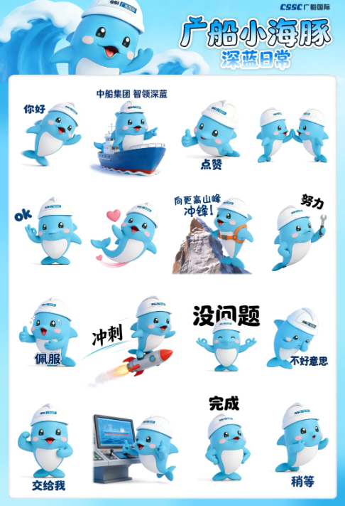 廣船小海豚?深藍(lán)日常系列表情包,以靈動可愛的小海豚為核心形象,融入廣船“深藍(lán)”底色與造船人的初心情懷,捕捉船廠工作與日常溝通的暖心瞬間。