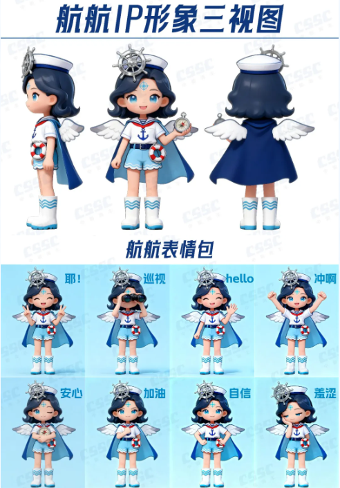 建建(造船擔(dān)當(dāng))以銀色防護(hù)頭盔(嵌船舶零件電子屏、印艦船剪影)、船錨腰帶、CSSC工裝及焊槍,凸顯造船匠心精神;航航(航行擔(dān)當(dāng))憑船舵頭飾、導(dǎo)航羅盤、海鷗披風(fēng)與船錨上衣,傳遞中船航行使命。二者以 “建造 - 航行” 閉環(huán),具象中船全鏈條實(shí)力,彰顯中船文化。