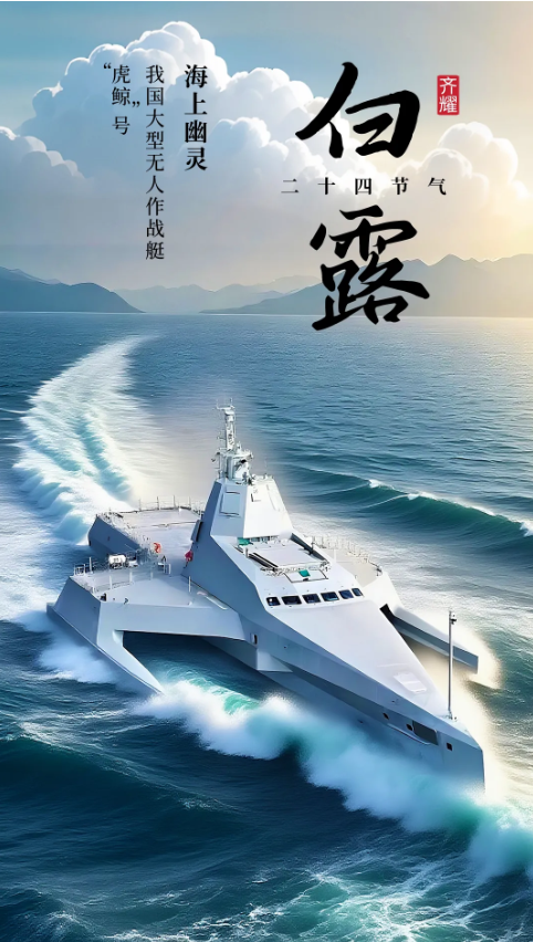 該海報(bào)以即夢AI為筆,繪就了一場跨越時(shí)空的對話,將“白露”的清冷賦予“海上幽靈”無人艇的鋒芒。