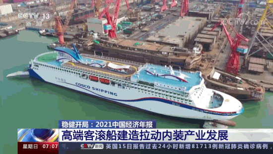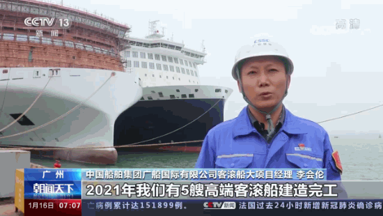 這里是中國船舶廣船國際的造船碼頭,多艘大型豪華客滾船正在緊張調(diào)試和建造。負(fù)責(zé)人告訴記者,2021年,像這樣的高端客滾船他們廠一共建造完工了5艘,產(chǎn)值占比達(dá)到約40%。